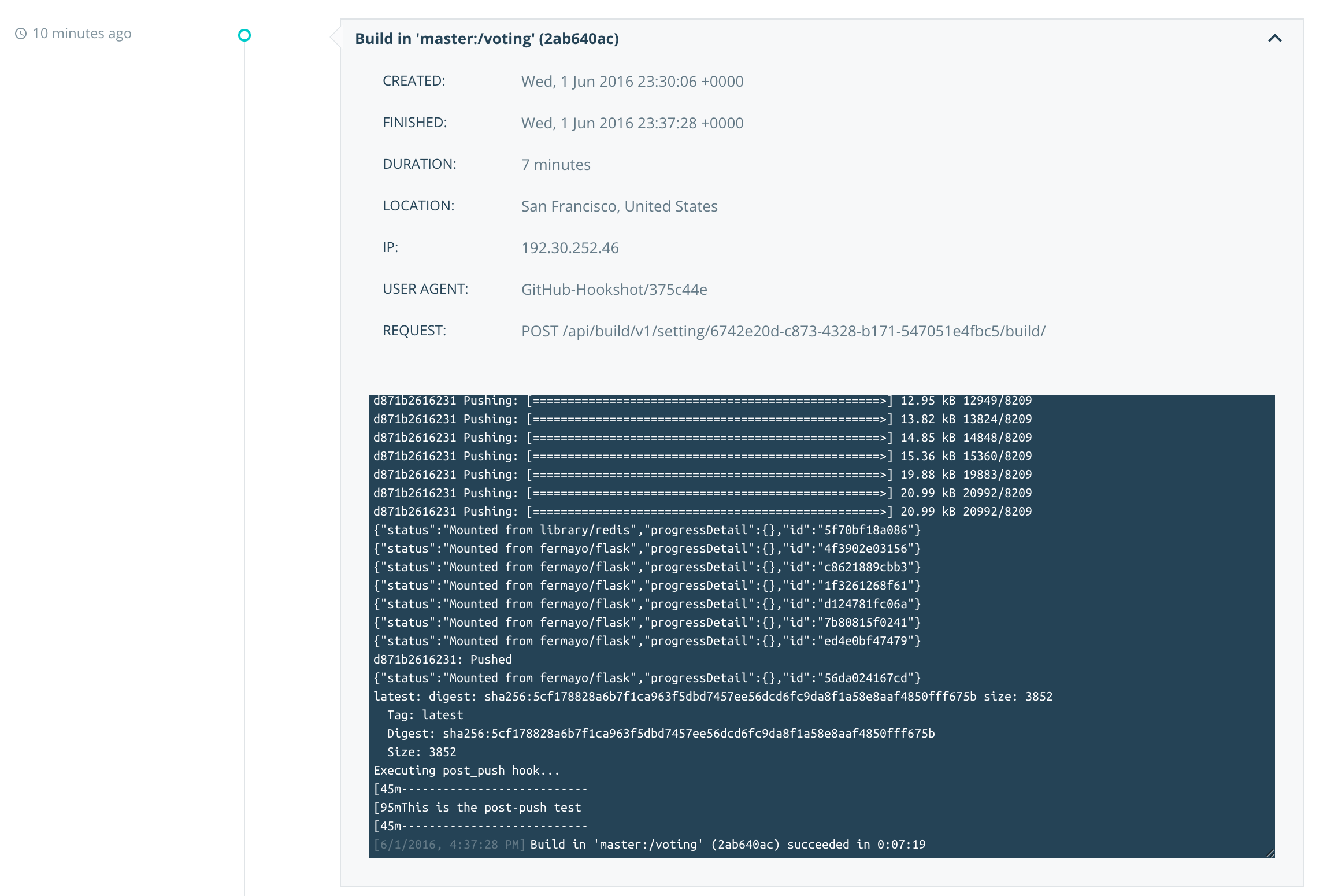 Congratulations! You have successfully configured Docker Cloud to automatically build a new Docker image each time you push a change to your application’s repository on GitHub.