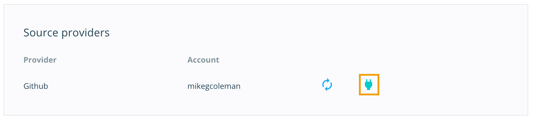 - Scroll down to the Source providers section. Click the power plug icon next to GitHub, and follow the procedure to link your GitHub account.