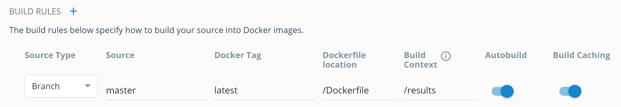 - Navigate to the Builds page and click ‘Configure Automated Builds’. Scroll down to Build Rule, and set the Build Context to /results: